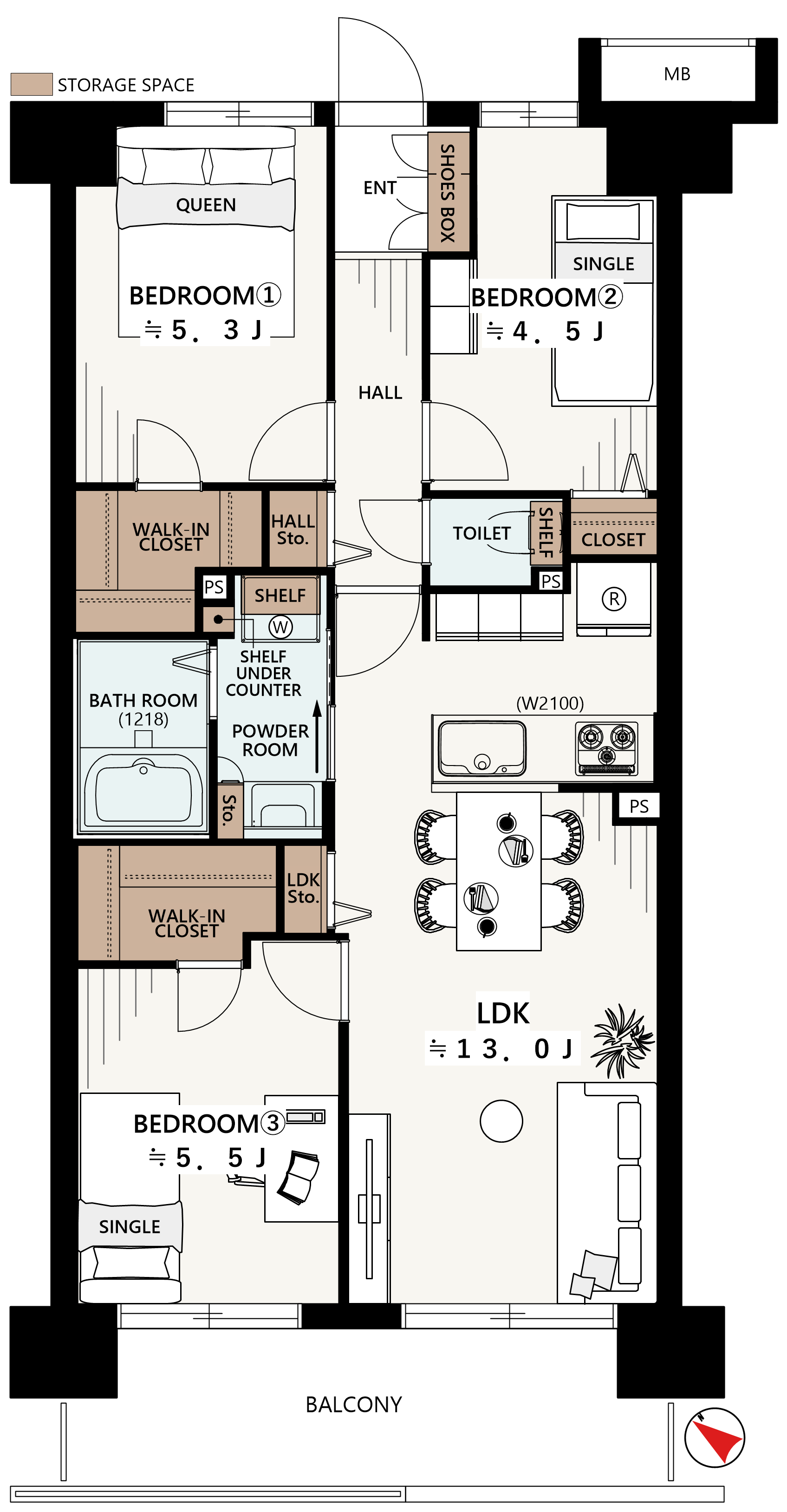 ■家具配置しやすい縦長LDKは約13帖確保